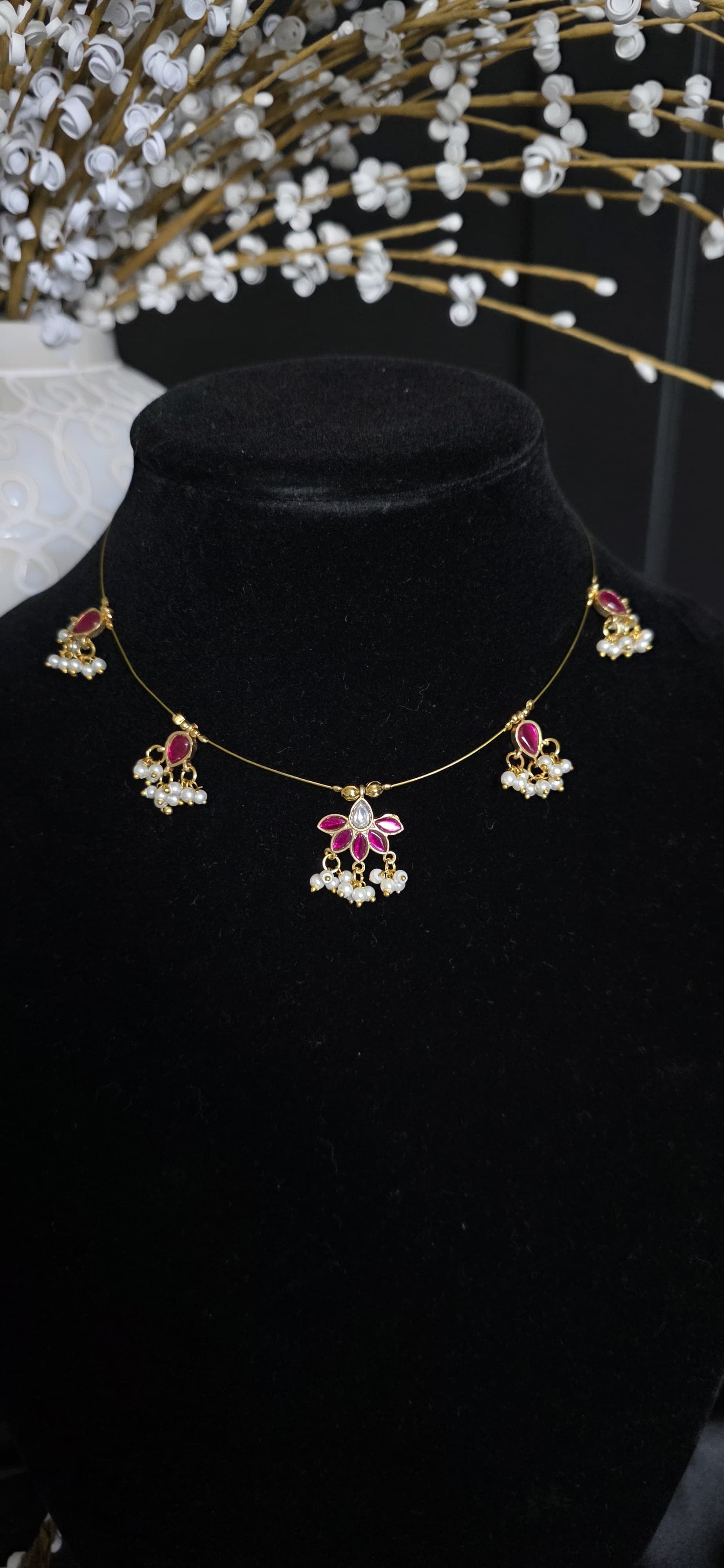 It features a delicate gold chain with a central pendant. The pendant has a symmetrical floral-like design made up of pink and white stones arranged in a geometric pattern. Dangling from the pendant are multiple pink stoned with pearl that resembles the lotus flower adding an elegant touch.